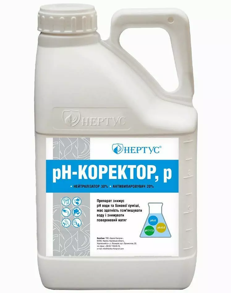 Нертус «рН-коректор» – це високоефективний рН-коректор, який застосовується для приготування бакових сумішей всіх видів ЗЗР і водорозчинних добрив. Завдяки оригінальному складу має здатність знижувати рН води та бакової суміші, пом'якшувати воду та зменшувати поверхневий натяг. Підкислюючий ефект здійснюється через знищення надлишку іонів-гідроксилу (ОН) і перетворення їх у воду. Застосування рН-коректора для води допомагає уникнути руйнування (гідролізу) ЗЗР, зберігаючи їх високу ефективність і надійність, не залежно від початкового рН води або бакової суміші. Антивипаровувач, що входить до складу препарату дозволяє продовжити час ефективного контакту бакової суміші з листовою поверхнею.
